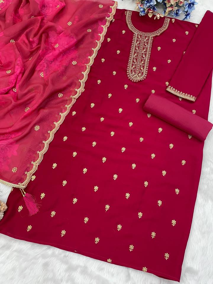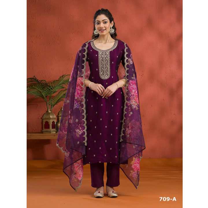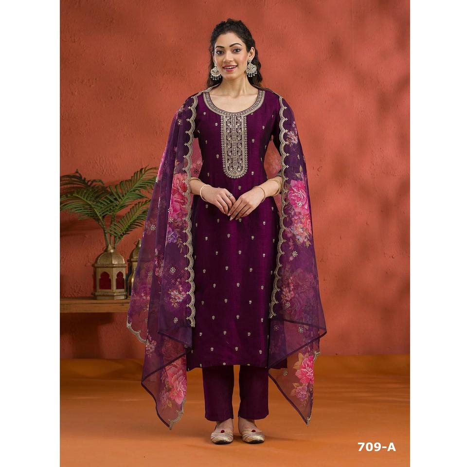 Conjunto de traje de tela de diseño Vichitra con elegante Organza Dupatta y cómodo fondo de algodón PV disponible para la venta