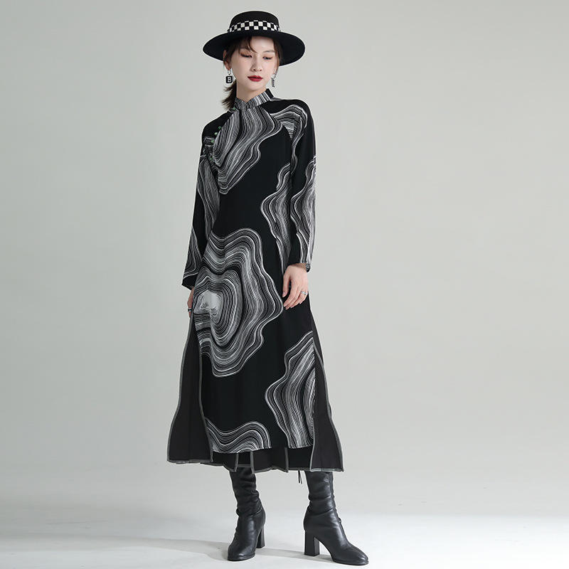 Ropa de mujer de diseñador, Vestido de manga larga con abertura alta, vestido Cheongsam negro de nuevo estilo chino Retro, vestidos de otoño para mujer