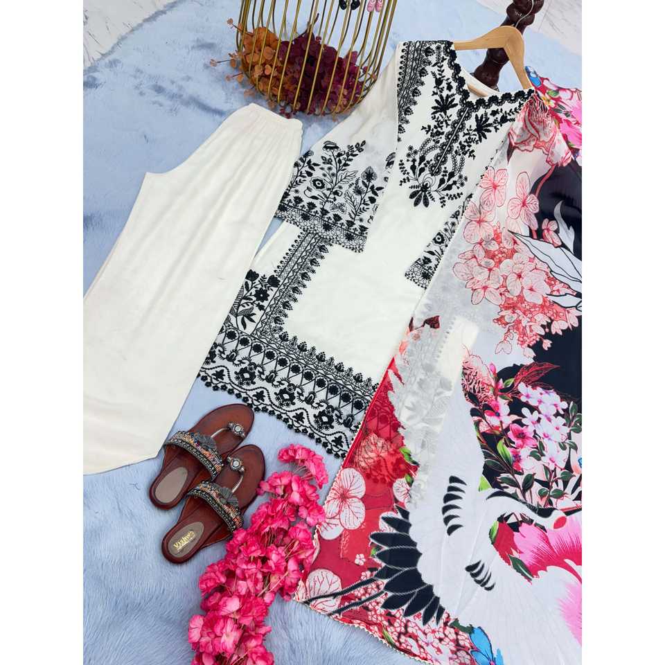 Conjunto Elegante de Top Blanco y Pantalones Plazzo con Dupatta de Diseño para Mujer, Talla M