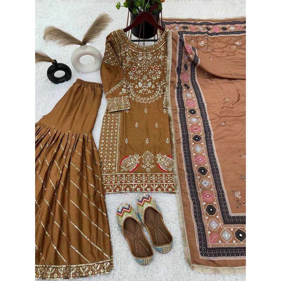 Conjuntos de traje de diseñador para mujer Top-Plazzo y Dupatta con trabajo de bordado pesado Aspecto elegante