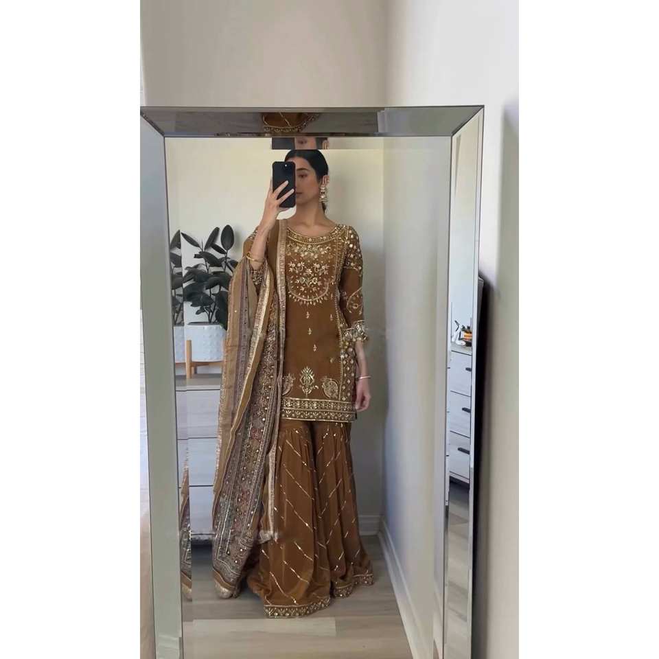 Conjuntos de trajes de diseñador para mujer con bordado pesado Top de trabajo-Plazzo y Dupatta para un aspecto elegante