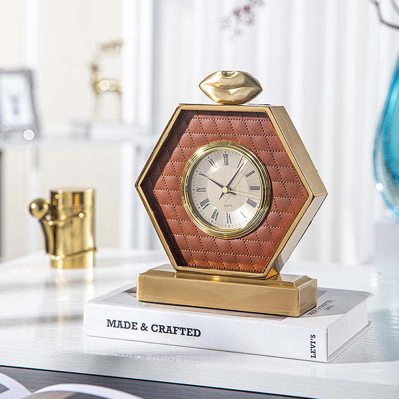 Reloj de escritorio personalizado, alarma de mármol directo de fábrica, ligero, de lujo, con patrón tejido, de cuero, para decoración de escritorio del hogar