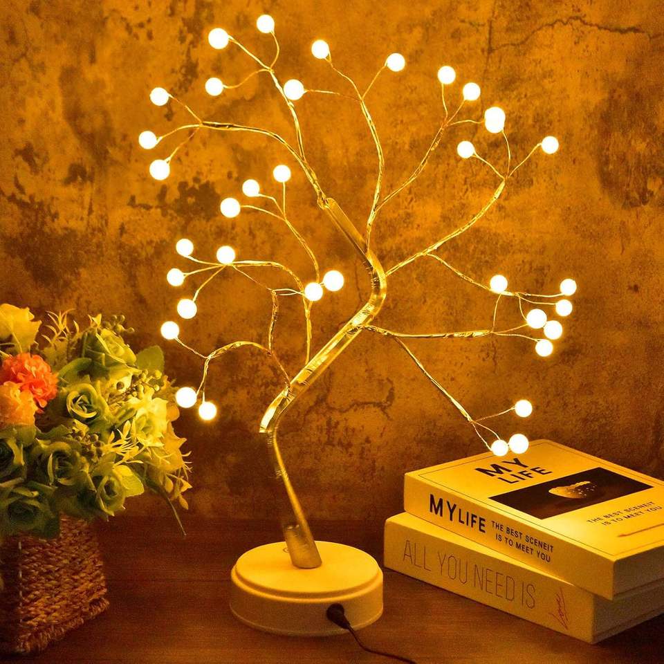 Lámpara de Escritorio Decorativa Tipo Bonsái LED Luz de Noche de Sobremesa Árbol de Hierro con Ramas Plateadas Perlas Hojas Doradas y Forma de Estrella para Navidad