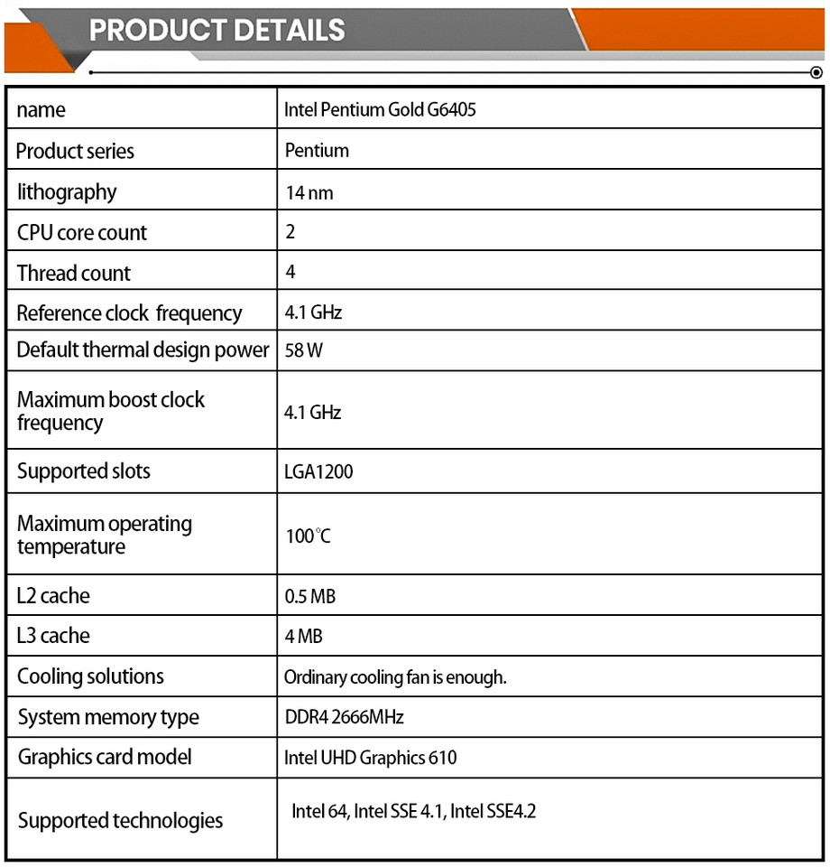 Procesador de Escritorio, Intel Pentium Gold G6405 2 núcleos, (Bandeja, Comet Lake Refresh arquitectura, 4 hilos, 4,1 GHz, LGA 1200,65W)