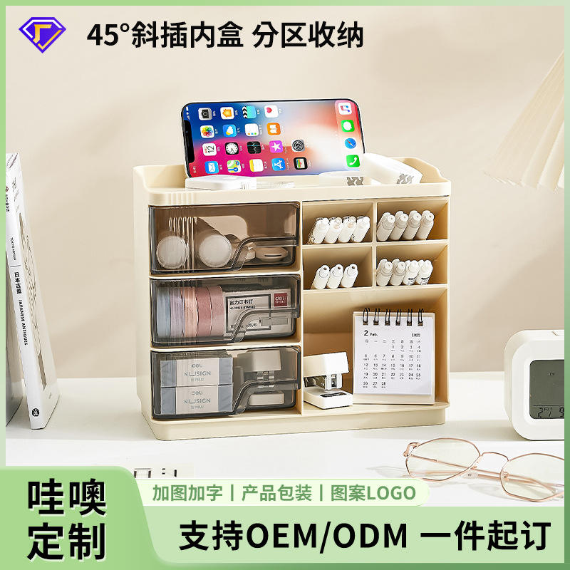 Caja de almacenamiento de escritorio con cajón inclinado, soporte para bolígrafos, organizador de papelería transparente de varias capas, escritorio de oficina de gran capacidad