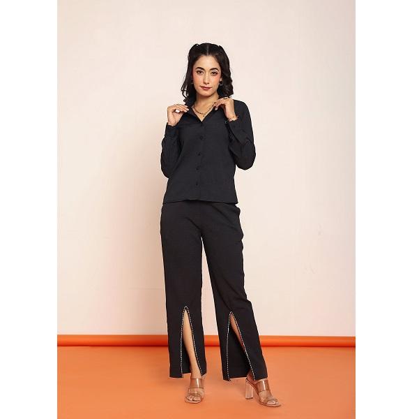 Conjunto de Dos Piezas para Mujer con Camisa Detallada con Pedrería y Pantalones, Atuendo Elegante con Adornos Brillantes, Estilo Moderno