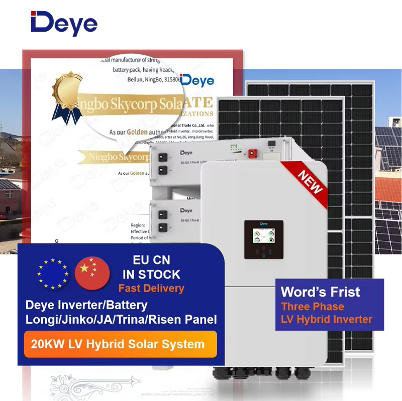 Sistema Solar con Inversor Híbrido Deye de 20kW, Trifásico, para Uso Doméstico, Batería Lifepo4 de 5kWh, Controlador MPPT, Paneles de Silicio Policristalino