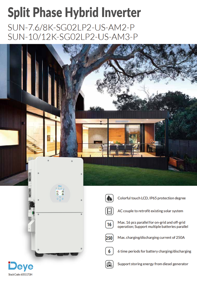 Inversor Híbrido Bifásico Deye US SUN-8/10/12/ en Stock, Envío Rápido, Precio Directo de Fábrica, Alta Eficiencia, Certificación IP65