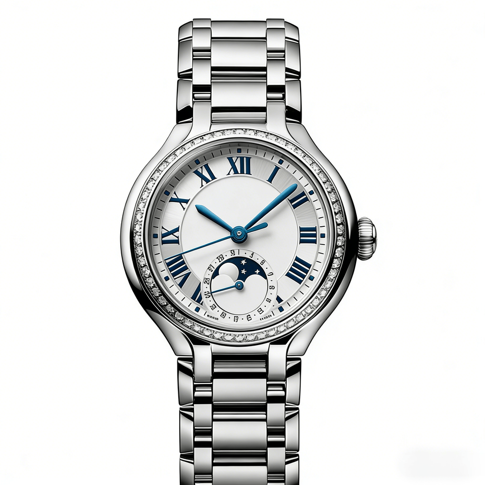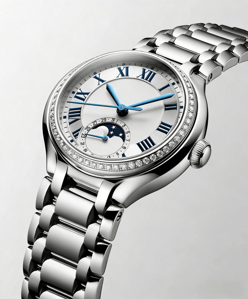 Reloj Automático con Fase Lunar y Bisel de Diamantes, con Números Romanos y Correa de Acero Inoxidable para Mujer, Longinesing