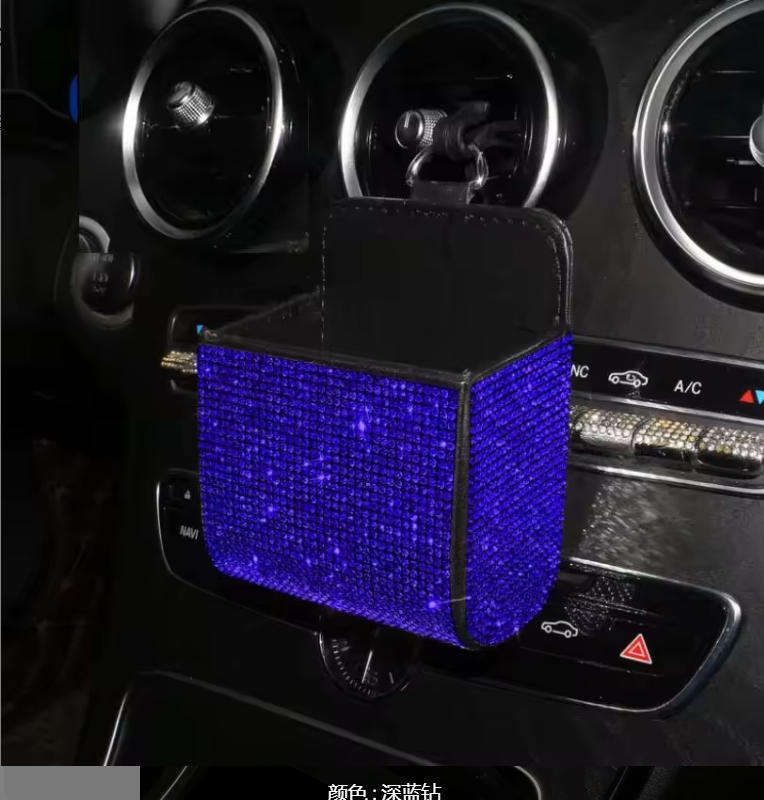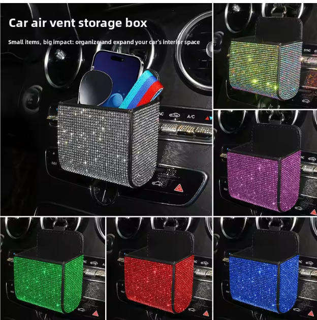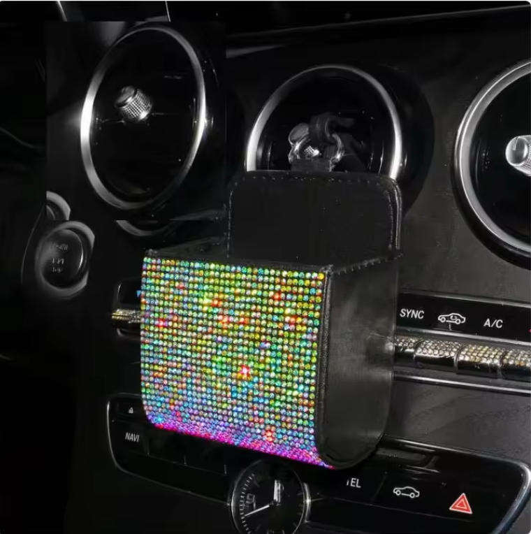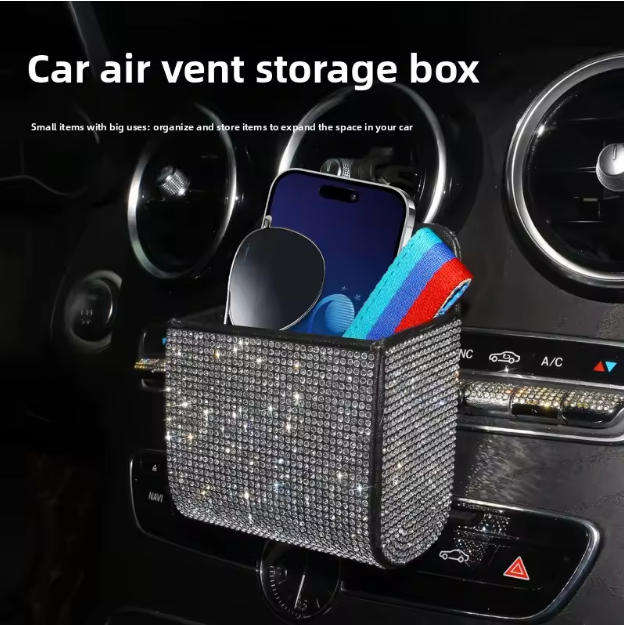 Caja de almacenamiento para coche con diamantes, soporte para teléfono, para rejilla de ventilación, multifunción, de cuero, con diamantes, bolsa de basura