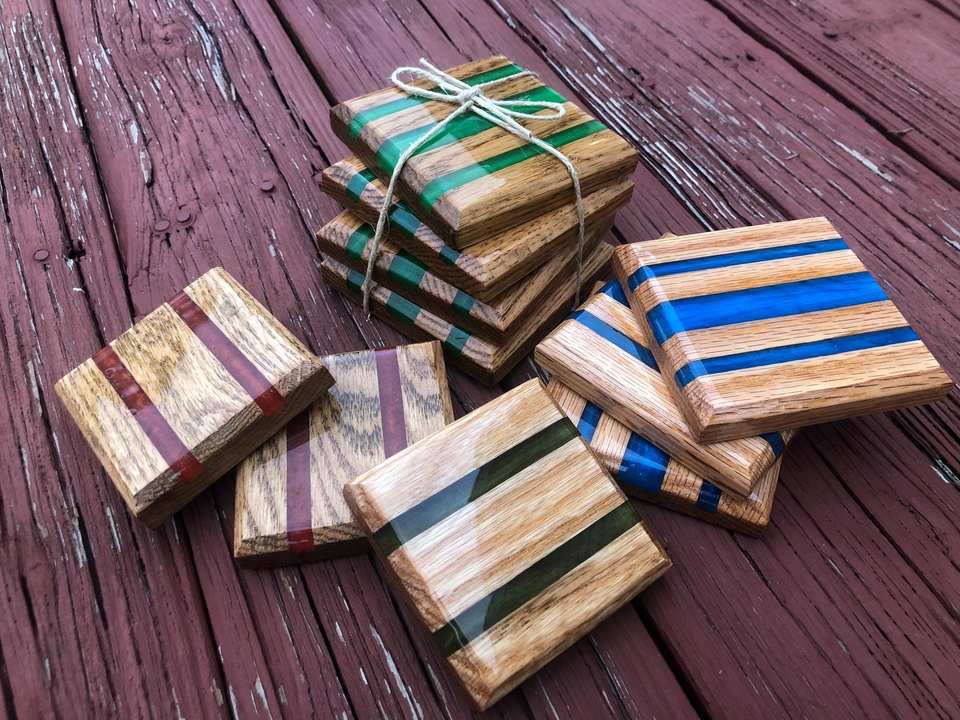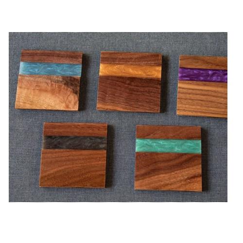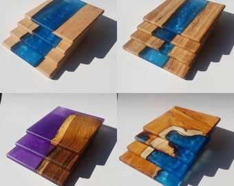 Posavasos de resina y piedra de madera de diferentes colores para bebidas, madera de pino natural y resina, paquete de regalo de inauguración de la casa de 6 tamaños personalizados