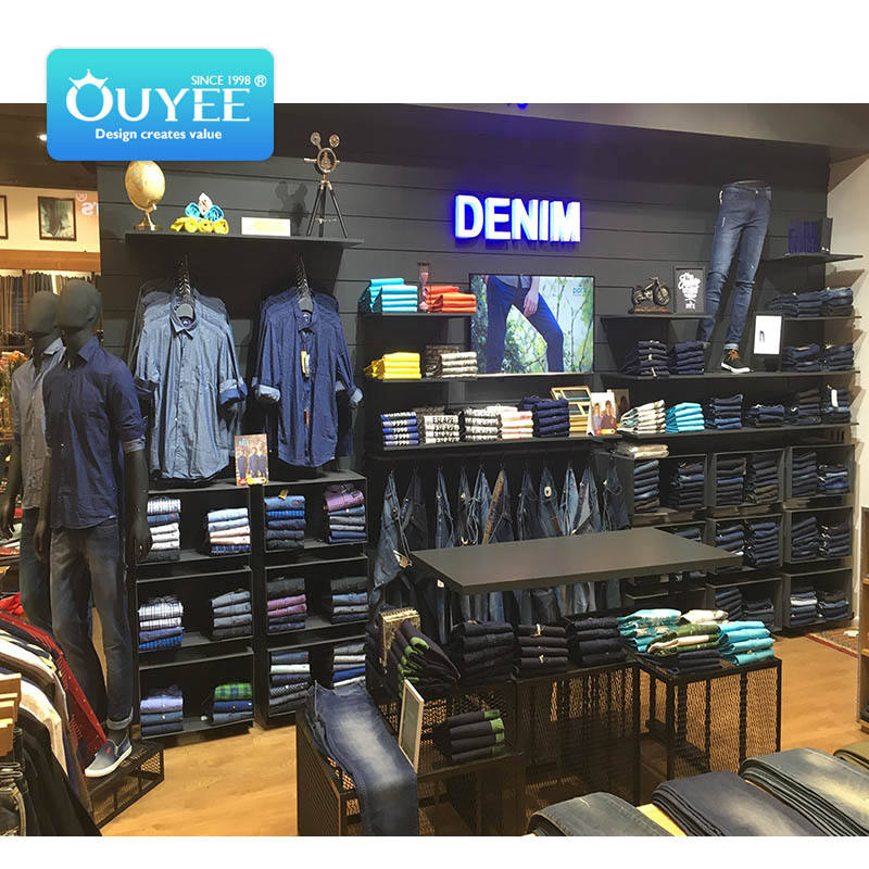 Exhibidores de Ropa de Diferentes Estilos para Kioscos, Mostradores de Tiendas en Centros Comerciales, Diseño de Pared de Madera, Exhibidores de Jeans