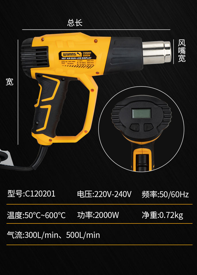 Pistola de Calor con Temperatura Ajustable y Pantalla Digital, Secador de Pelo, Regulación Eléctrica de Temperatura