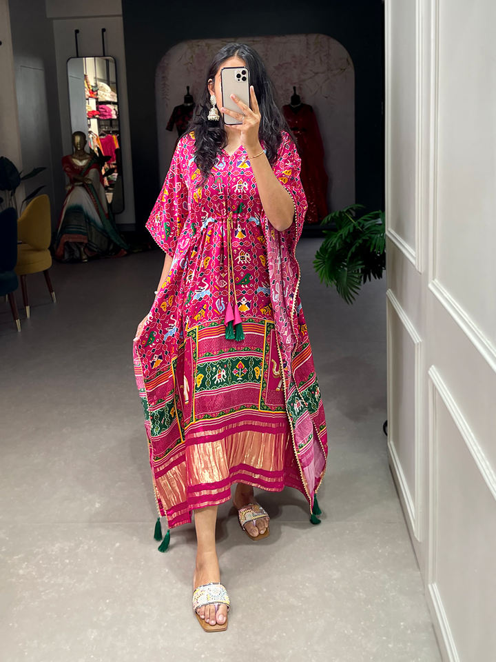 trabajo de caftán:Impresión digital con borde de encaje Gotta Patti, también incluye borlas.