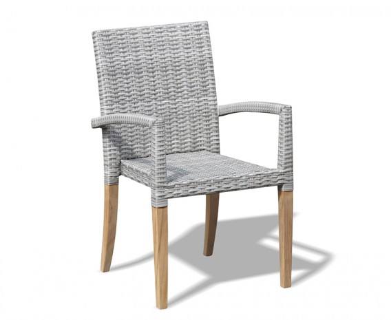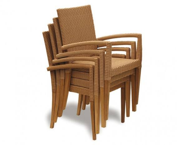 Silla de comedor hecha de marco de madera de teca maciza con asiento y respaldo cubierto de ratán tejido sintético para uso interior y exterior