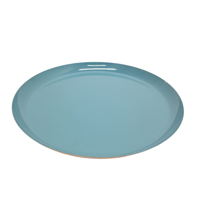 Plato redondo moderno ecológico de hierro, acabado azul cielo, tamaño personalizado disponible para decoración de restaurantes y hoteles