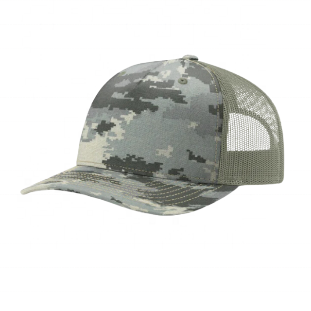 Vietnam Hat Factory Low Tariff 5-Panel Camuflaje Impresiones Malla Camioneros Sombreros Pre-Curved Twill/Poliéster Custom 112 Camo Hat Patch