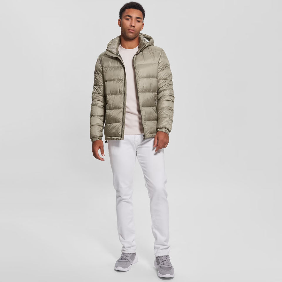 Oferta directa de fábrica, chaqueta acolchada ligera para hombre de alta calidad, resistente al agua, recubierta, empacable, con capucha, piel larga, delgada