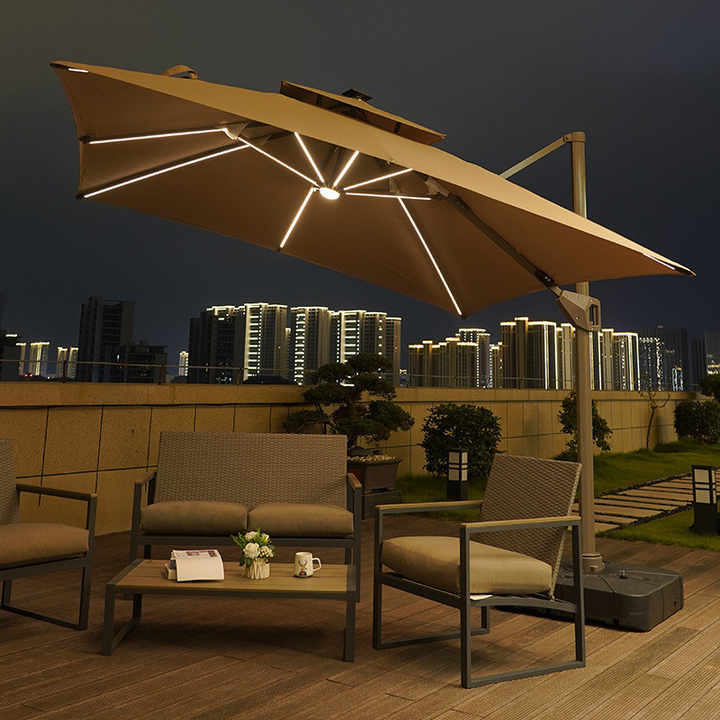 Precio de fábrica directo Paraguas de patio LED impermeable con luces solares Parasol voladizo para exteriores para jardín Terraza Azotea