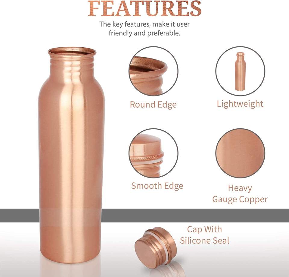 Precios directos de fábrica 100% botella de agua de cobre puro con tapa para Ayurveda beneficio de la salud juntas libres botellas a prueba de fugas de Metal