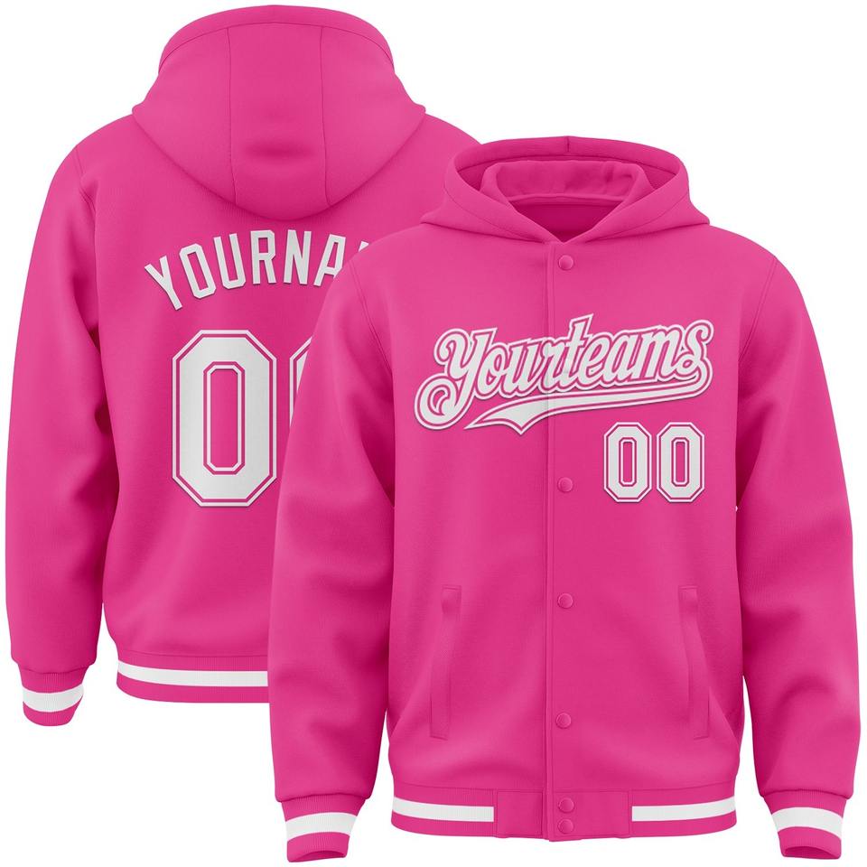 Directo de la industria, venta al por mayor, informal, invierno, personalizado, rosa, blanco, bombardero, Full-Snap, Varsity, Letterman, chaqueta con capucha
