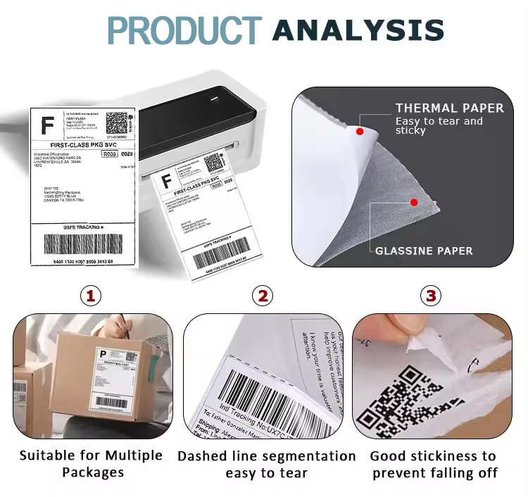 Adhesivo fuerte: Asegura que la etiqueta se mantenga firmemente adherida a los paquetes, reduciendo el riesgo de desprendimiento durante el envío y el manejo.