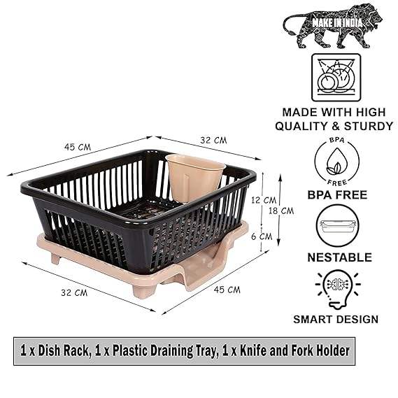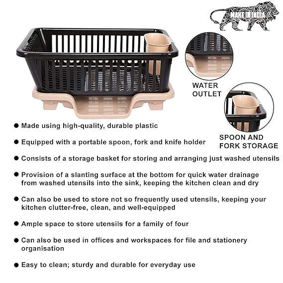 Escurridor de Platos 3 en 1, Cesta para Utensilios de Plástico Resistente con Soporte para Cucharas y Bandeja Escurridora Extraíble | Marrón Irrompible