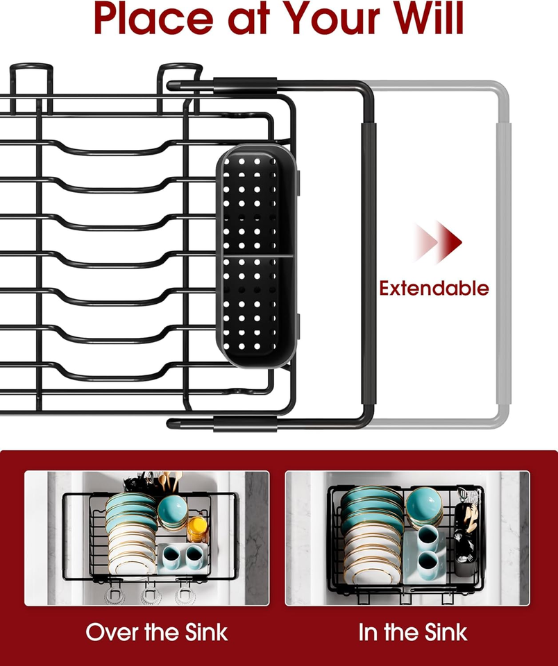 Escurridor de Platos Extensible para Fregadero, de Acero al Carbono, con Soporte para Cubiertos y Vasos