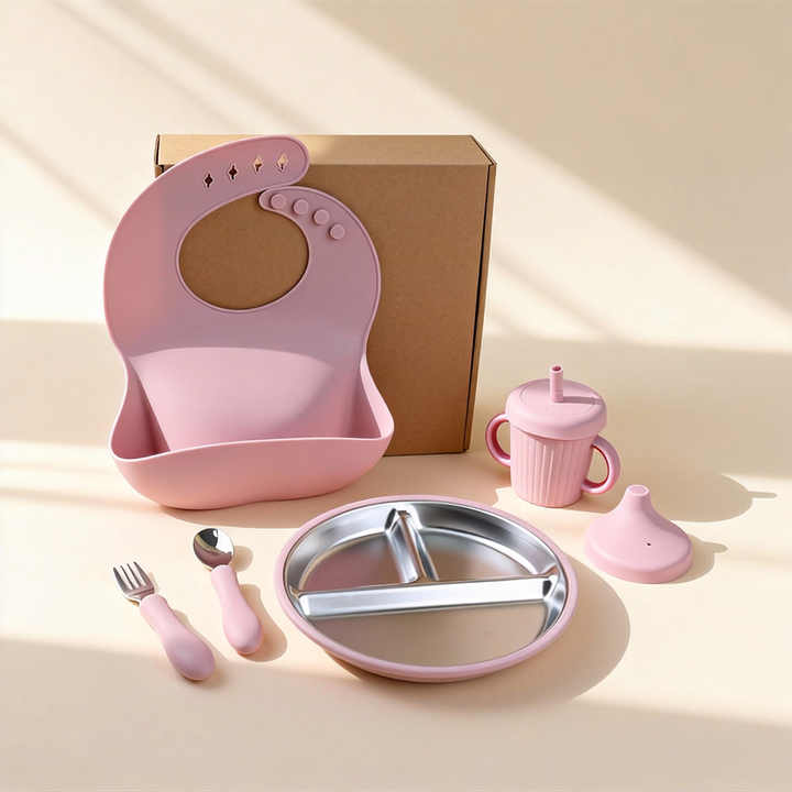1 plato, 1 vaso con boquilla y 2 tapas, 1 babero, 1 cuchara y tenedor