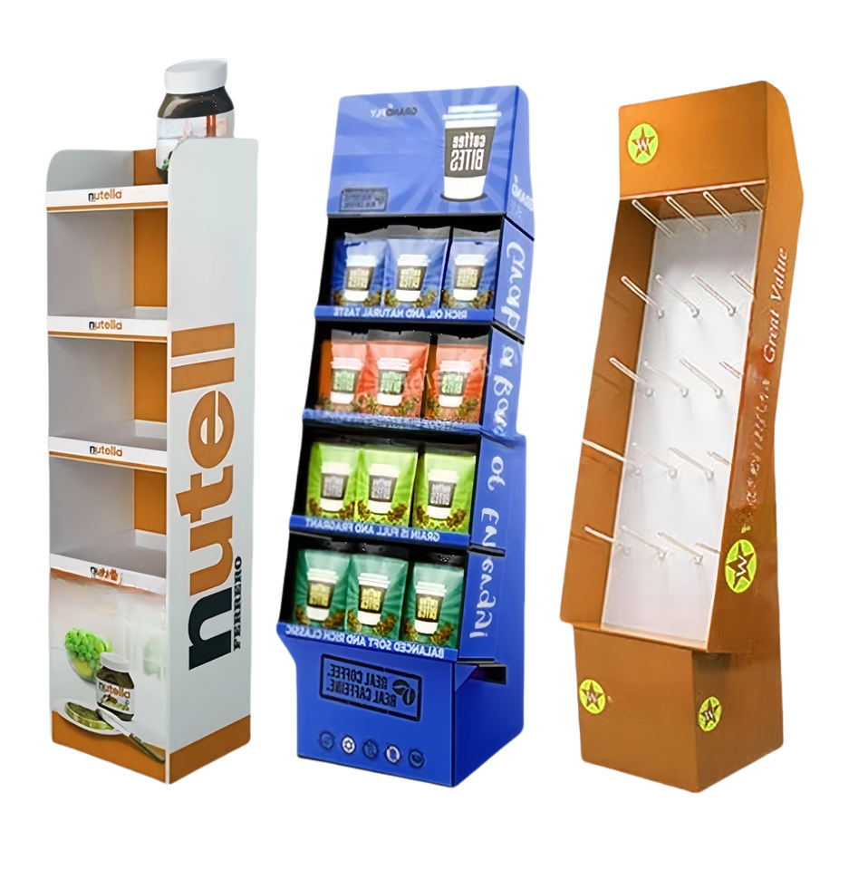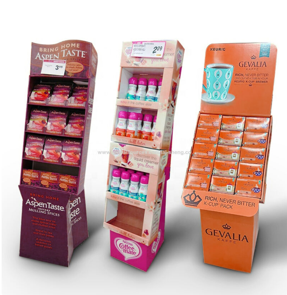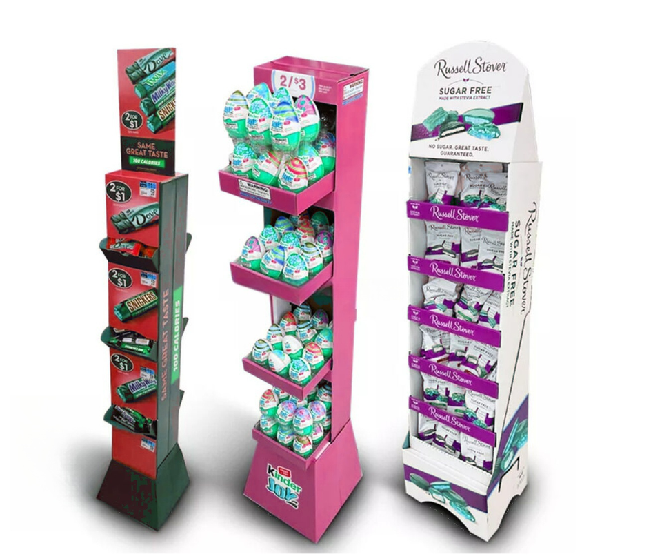 Estante de exhibición Soporte de exhibición de piso POP de cartón para Snickers de supermercado, chocolate, papas fritas, dulces
