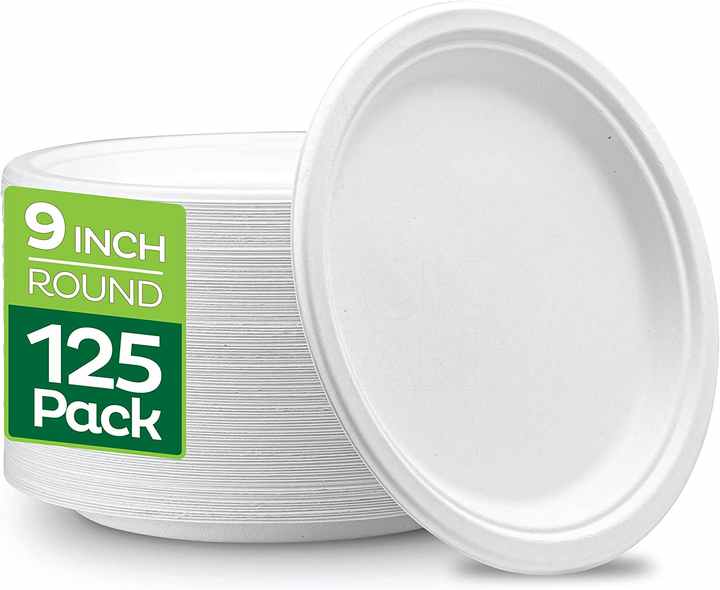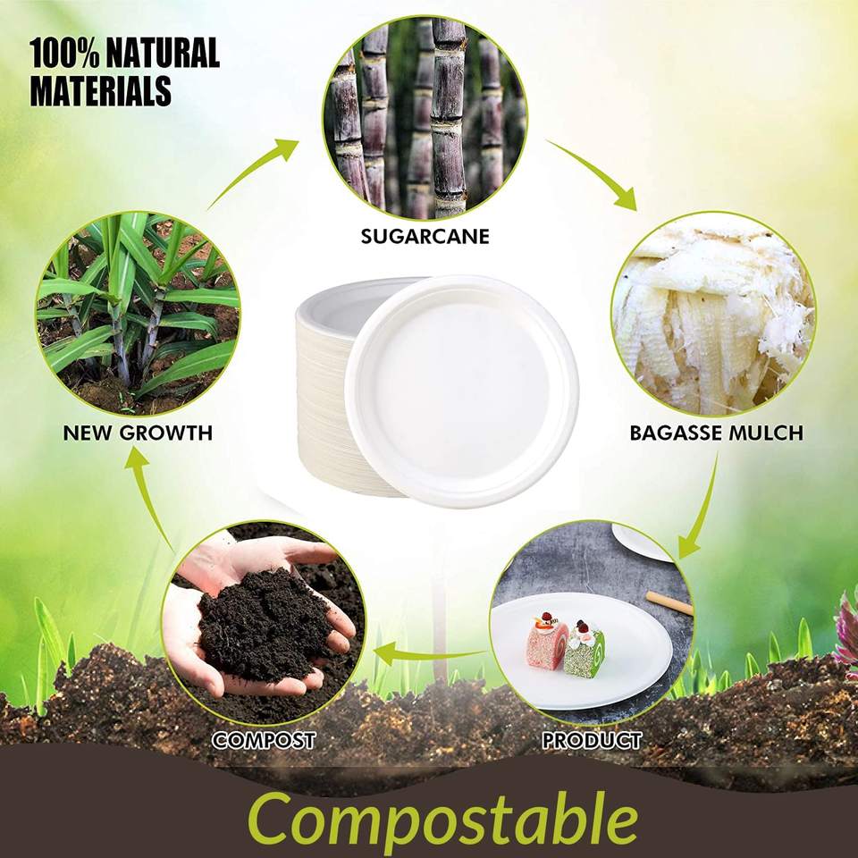 Platos desechables de alta resistencia de 9 pulgadas, platos de papel compostables de caña de azúcar biodegradables blancos de 9 ", plato de bagazo desechable