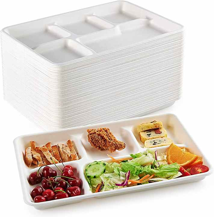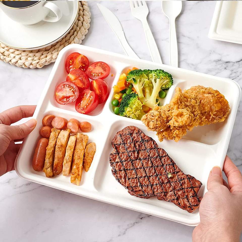 Bandejas de Almuerzo Desechables y Compostables de 5 Compartimentos, Ecológicas, Ligeras, Hechas de Bagazo de Caña de Azúcar, Blancas, BIOPACK