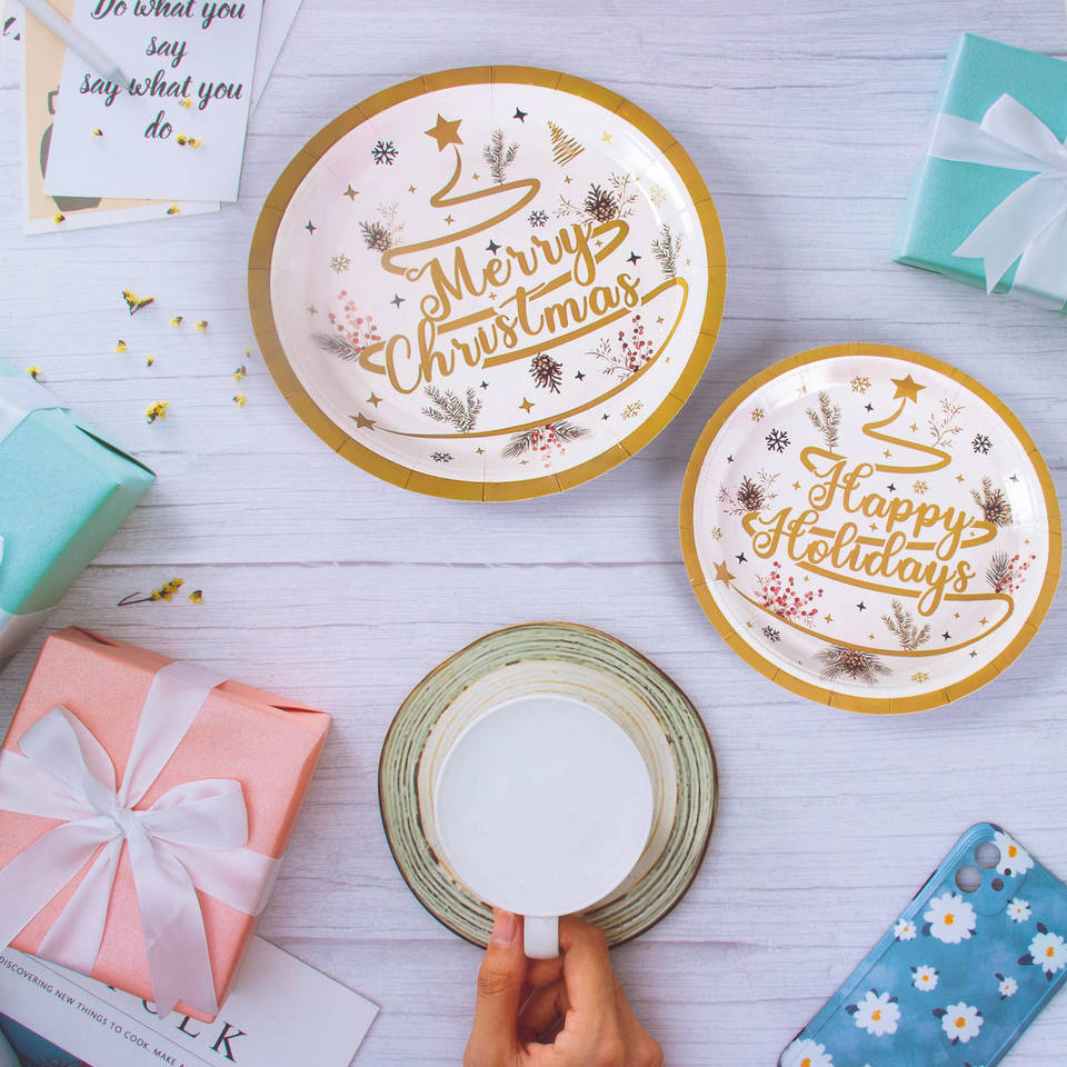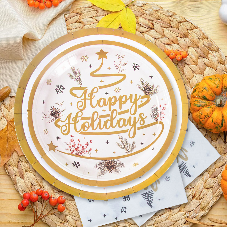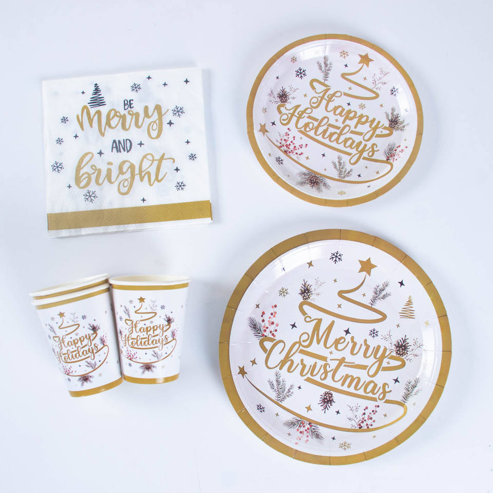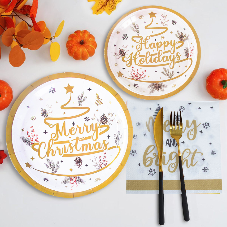 Juego de Vajilla Desechable de Papel FSC para 8 Personas, Diseño Navideño Completo y Bonito, Incluye Platos de Papel de 7/9 Pulgadas, Vasos y Servilletas