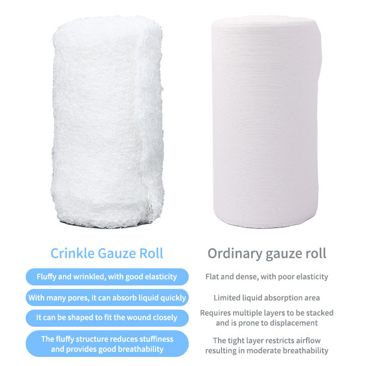 Venda desechable de primeros auxilios, vendaje elástico de gasa desodorizada, gasa ondulada de baja adherencia, gasa arrugada de alta absorción, rollo de gasa arrugada