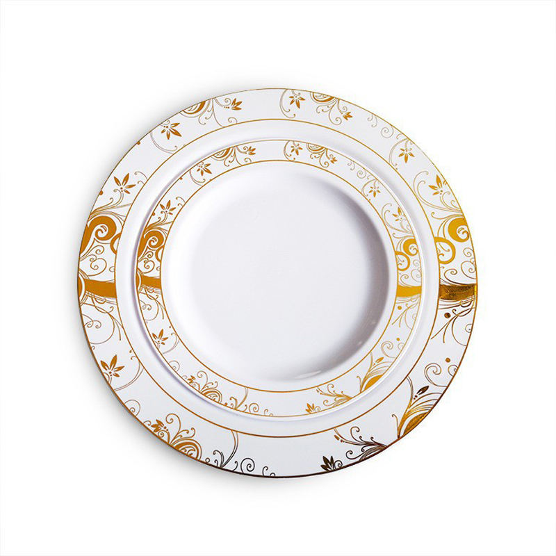 Plato de borde de oro y plata desechable, plato de fiesta ecológico de plástico duro PS de grado alimenticio de 7,5/10,25 pulgadas