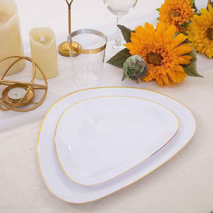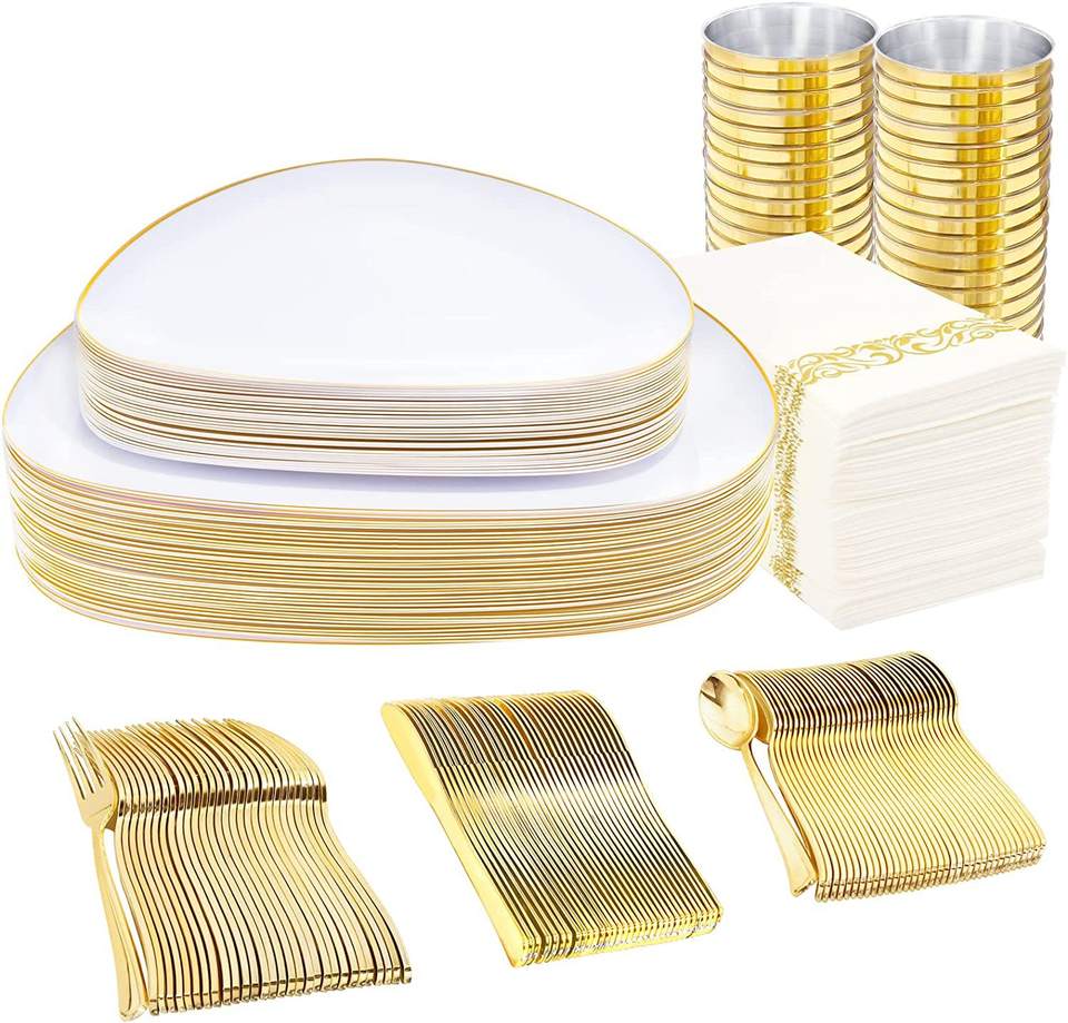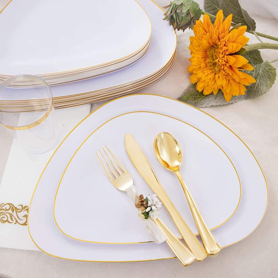 Juego de platos desechables de plástico resistente con borde de oro blanco, cucharas, cubiertos, cuchillos para fiesta de boda