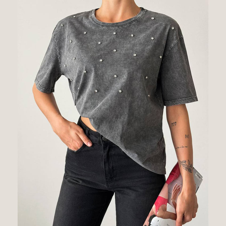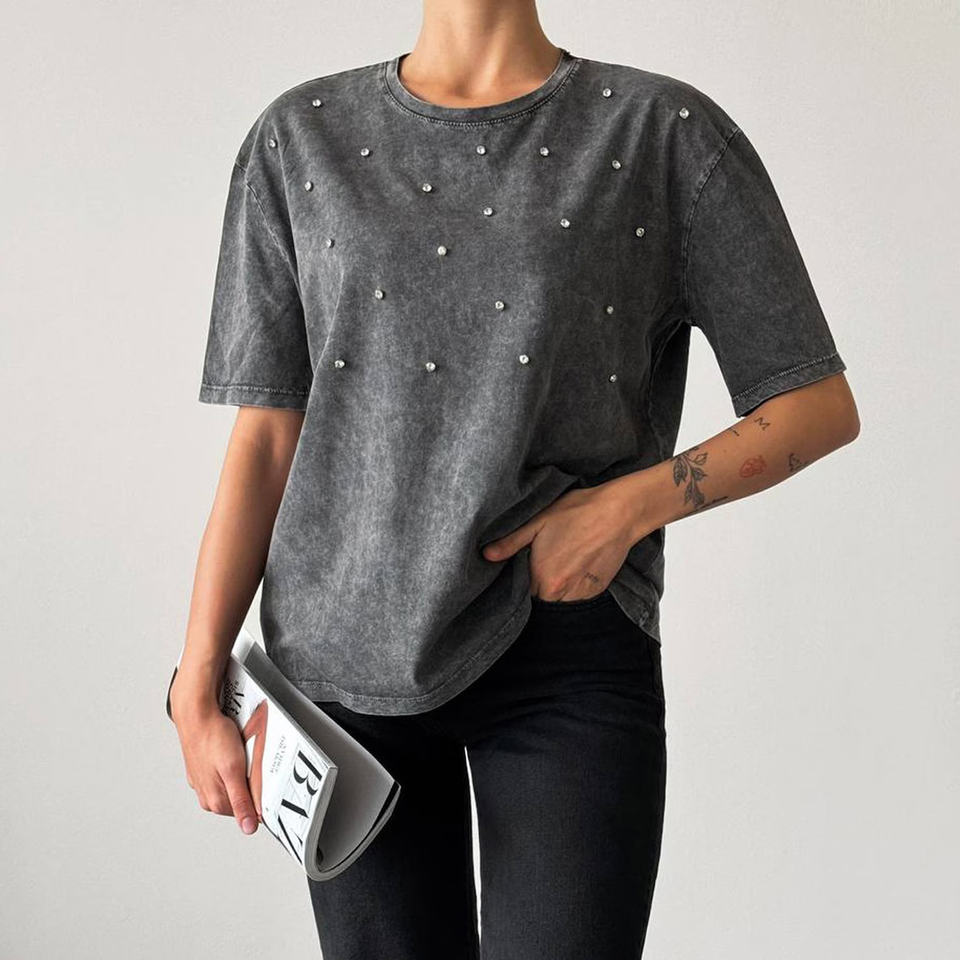 Camiseta de Hombre Oversize de Manga Corta con Hombros Caídos, Efecto Desgastado y Decolorado por el Sol, de Tejido Pesado, con Pedrería Personalizada y Lavado Ácido