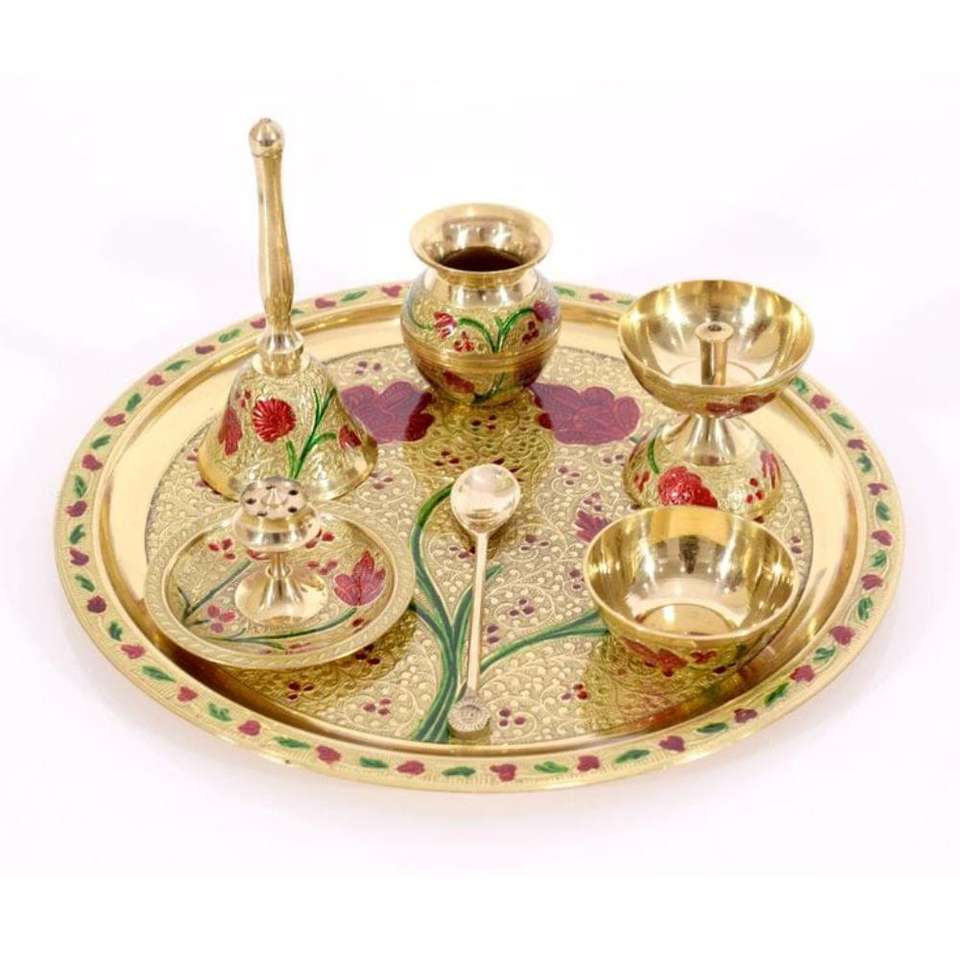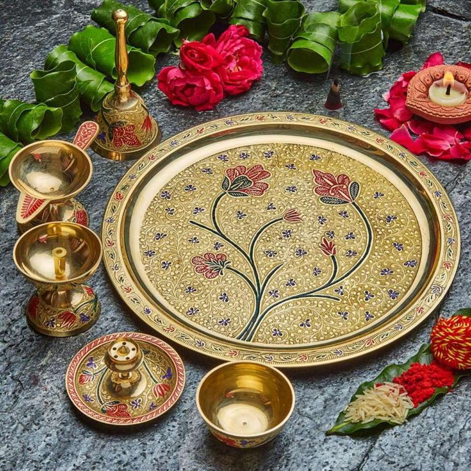 Juego de Regalo de Accesorios para Decoración de Diwali, Thali Redondo de Latón de 12 Pulgadas con Artículos de Pooja, Juego de Regalo de Lujo Personalizado para Bodas