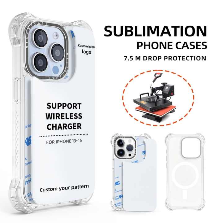 Funda para Teléfono Celular Transparente Anti-Amarillamiento con Carga Inalámbrica para Sublimación para iPhone 16 15 14 13 Pro Max