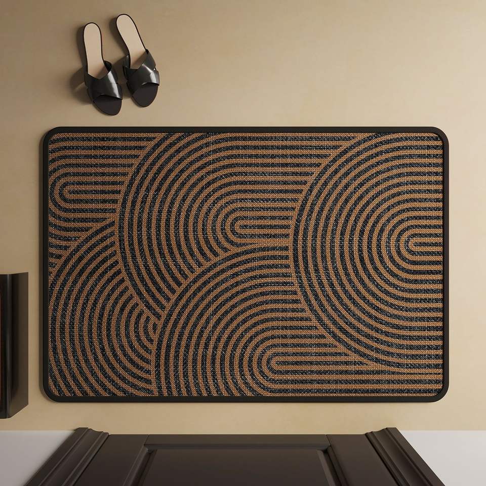 Tapete para Puerta con Patrón Geométrico Rectangular Negro, Imitación Lino, Lavable a Máquina, Antideslizante, para Entrada del Hogar