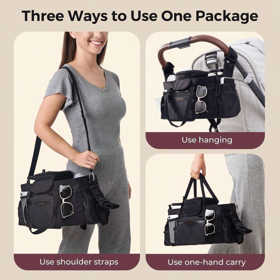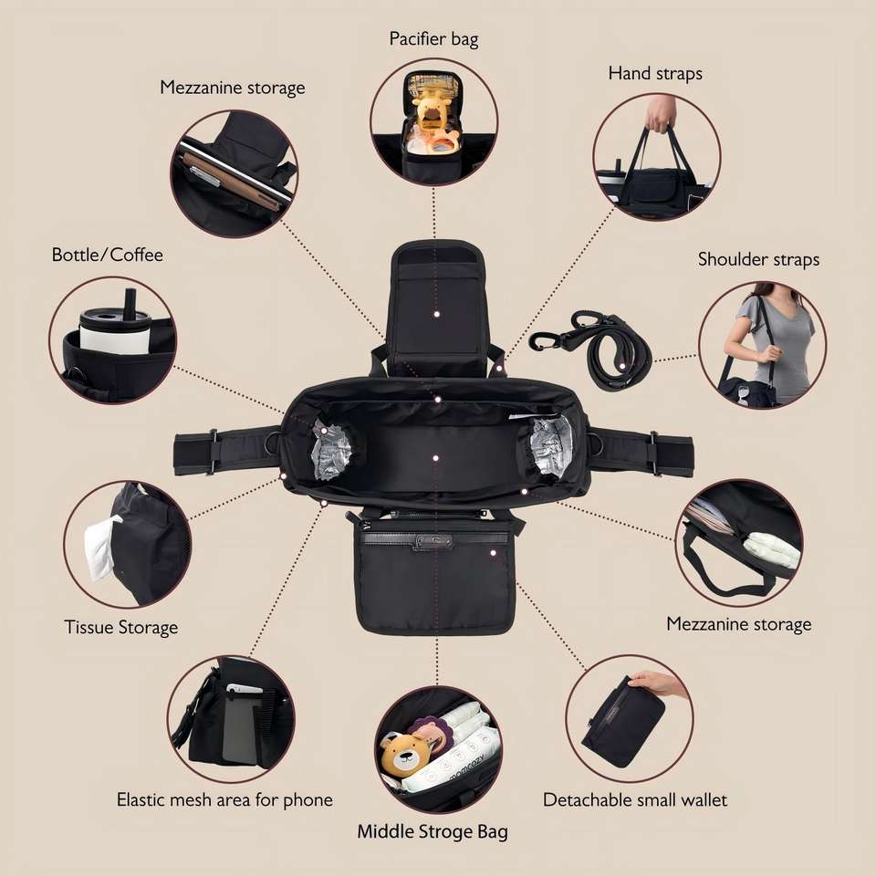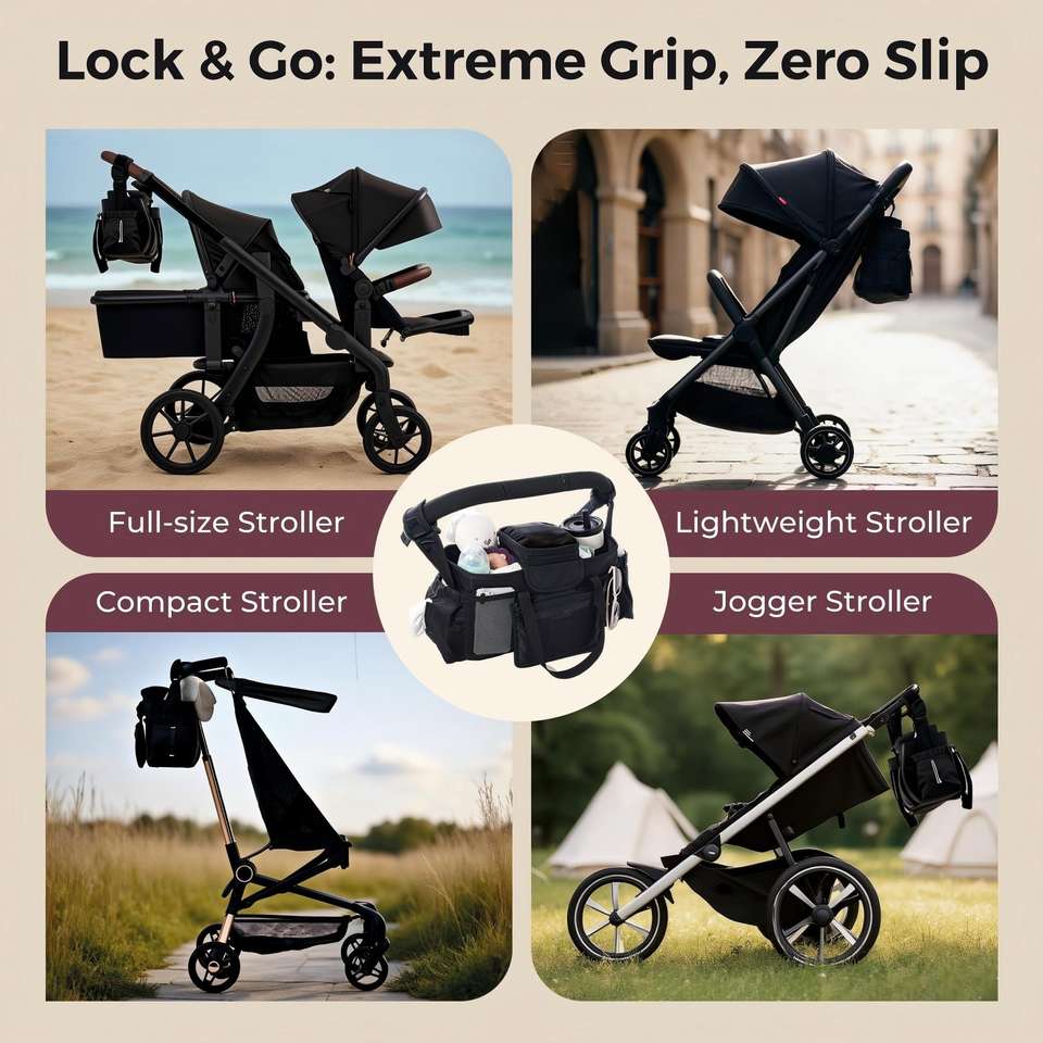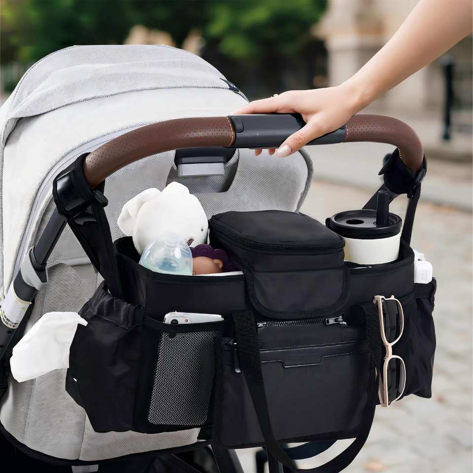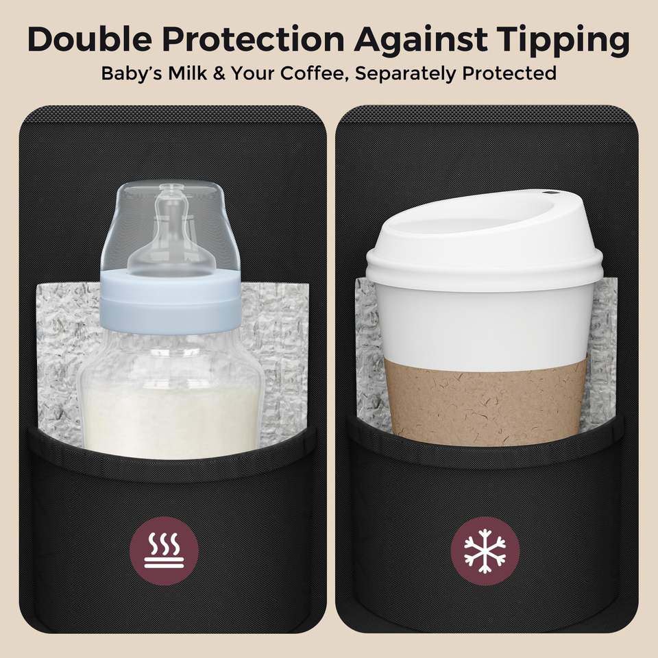 Organizador Doble Extra Grande para Cochecito Max | Resistente al Agua | Bolsa para Chupetes y Mordedores de Grado Alimenticio | Portavasos Aislado para 2 Bebidas |