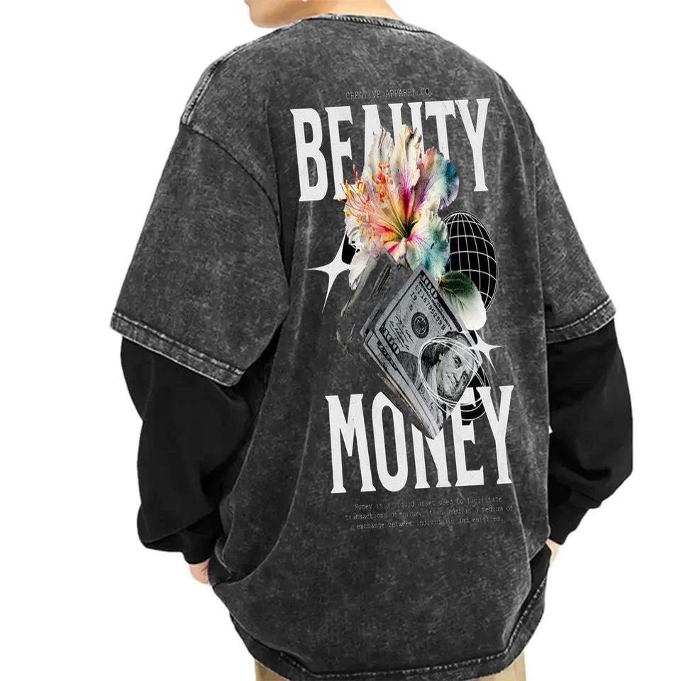 Camiseta de Manga Larga para Hombre, Doble Capa, Personalizada, de Algodón de Alta Calidad, Estilo Vintage, con Rayas Lavadas al Ácido, Corte Holgado