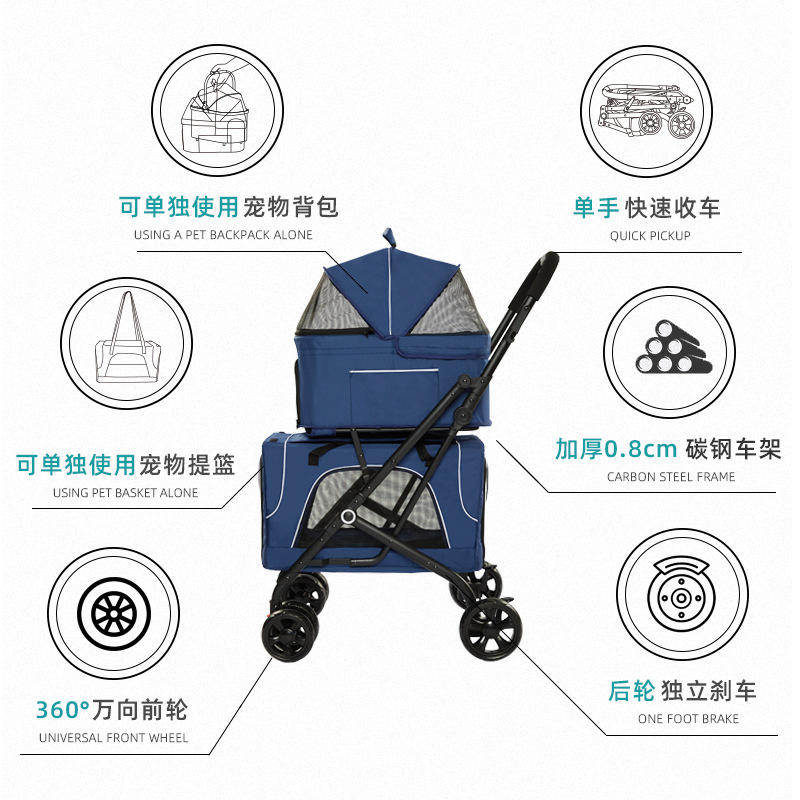 Carrito de Doble Capa para Mascotas, Perros y Gatos, Desmontable, de Tela Oxford Azul, con Ventanas de Malla y Cuatro Ruedas