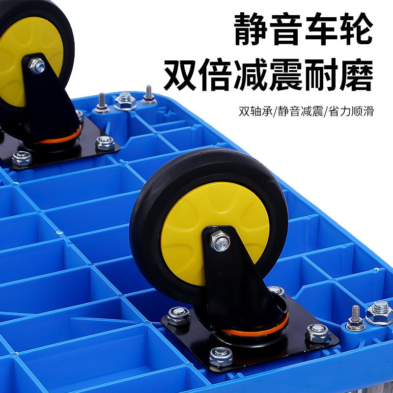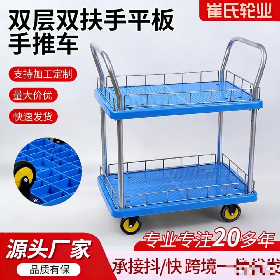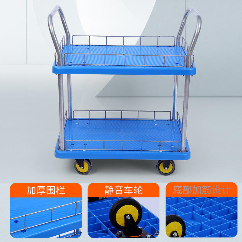 Carretilla de Plástico de Doble Capa con Barandillas Fijas, Carro de Herramientas Móvil de Cuatro Ruedas para Manejo en Almacén 55x84.5x101