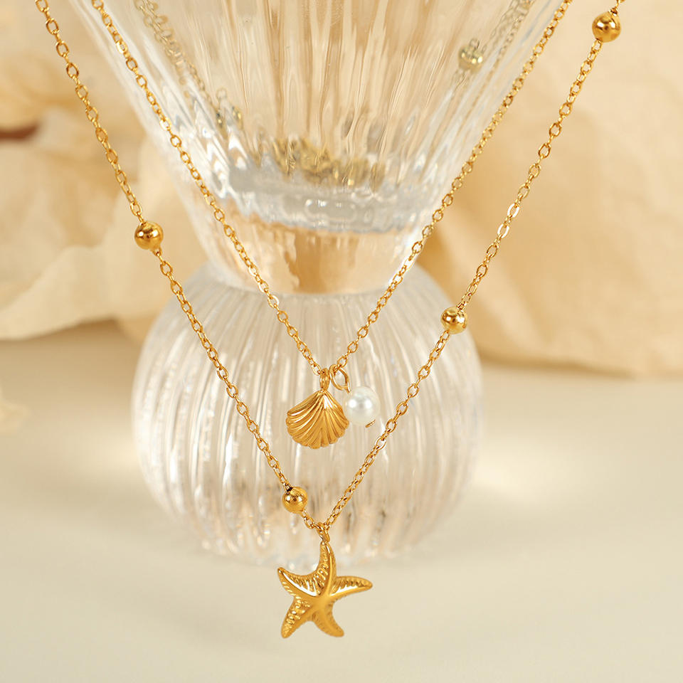 Collar de Doble Capa con Diseño de Estrella de Mar y Concha, Acero Inoxidable, Chapado en Oro de 18K, Cadena para Clavícula, Estilo Vacaciones de Verano, Joyería para Fiesta