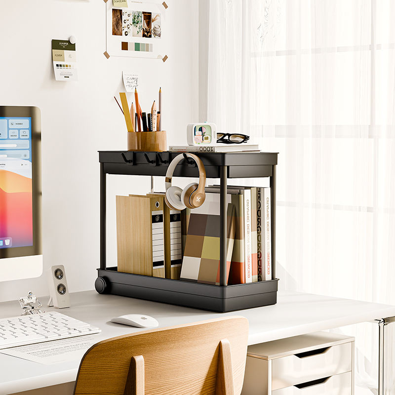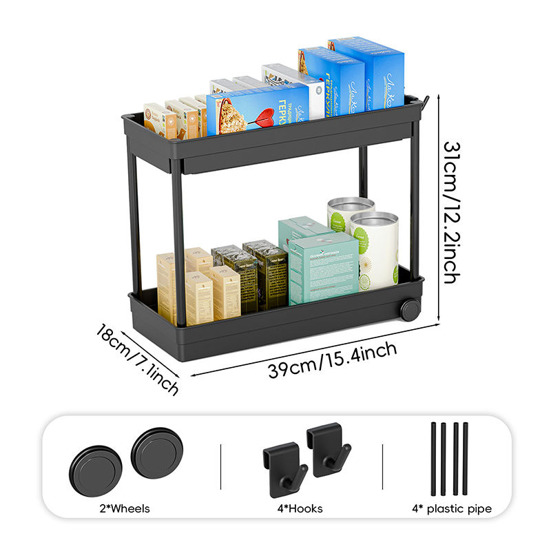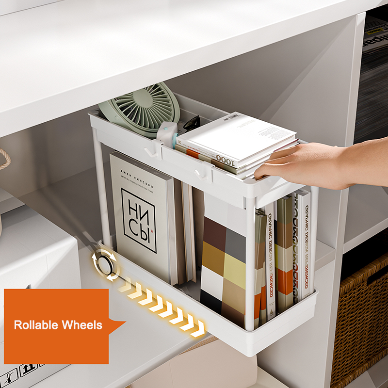 Estante de almacenamiento de doble capa debajo del fregadero, estante de almacenamiento de condimentos, cesta organizadora, cajón con ganchos