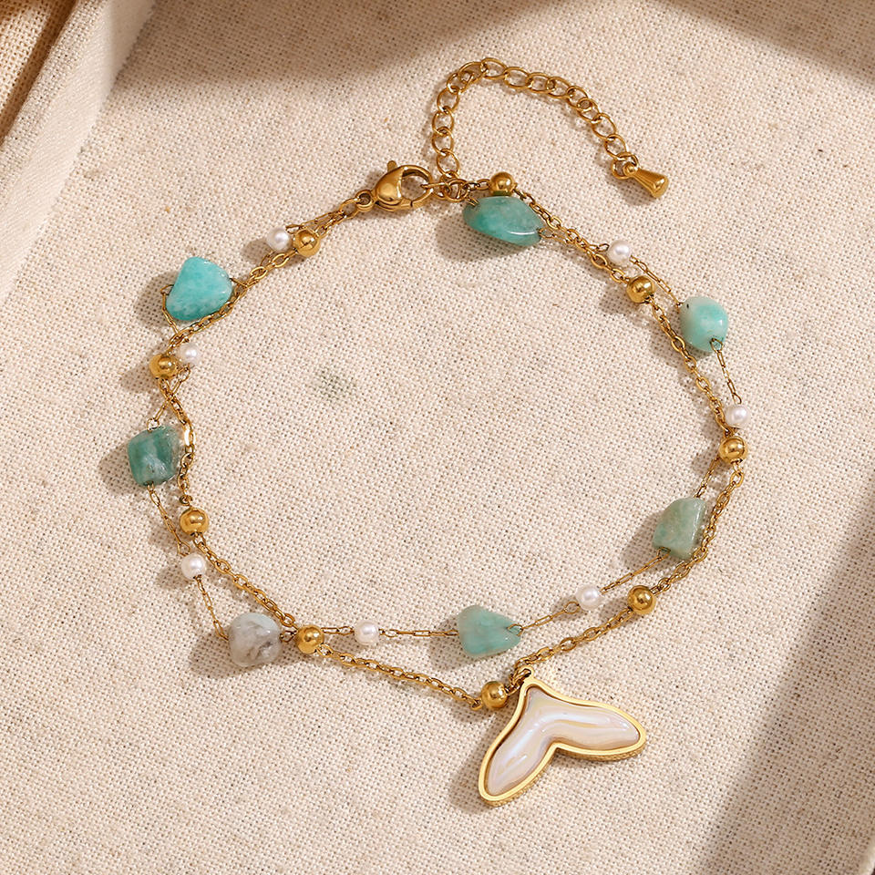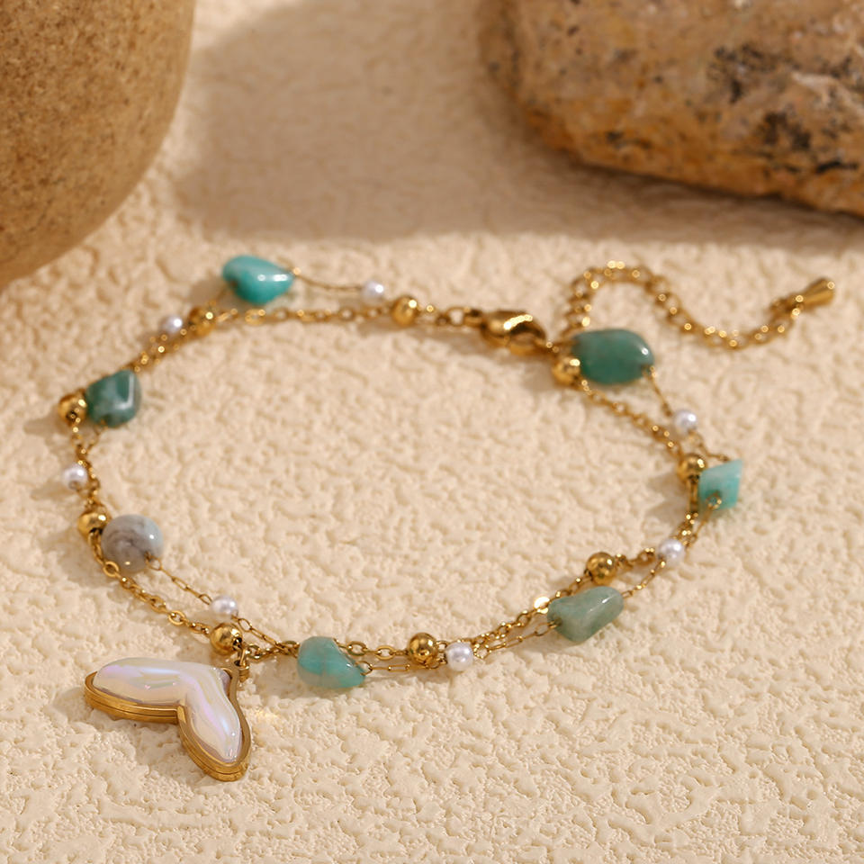 Tobillera de cadena de cuentas de turquesa de doble capa, cola de ballena, piedra Natural, joyería chapada en oro, tobillera de acero inoxidable 316L