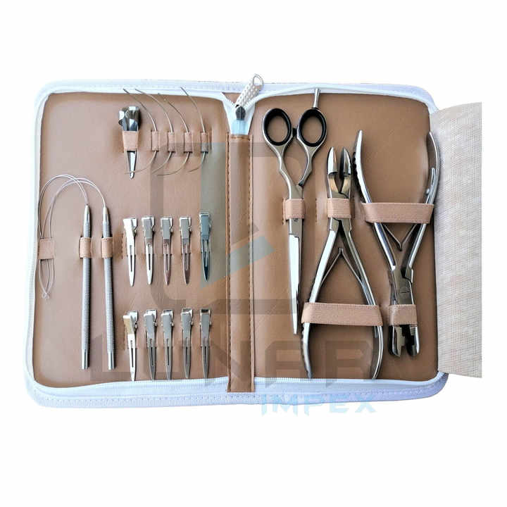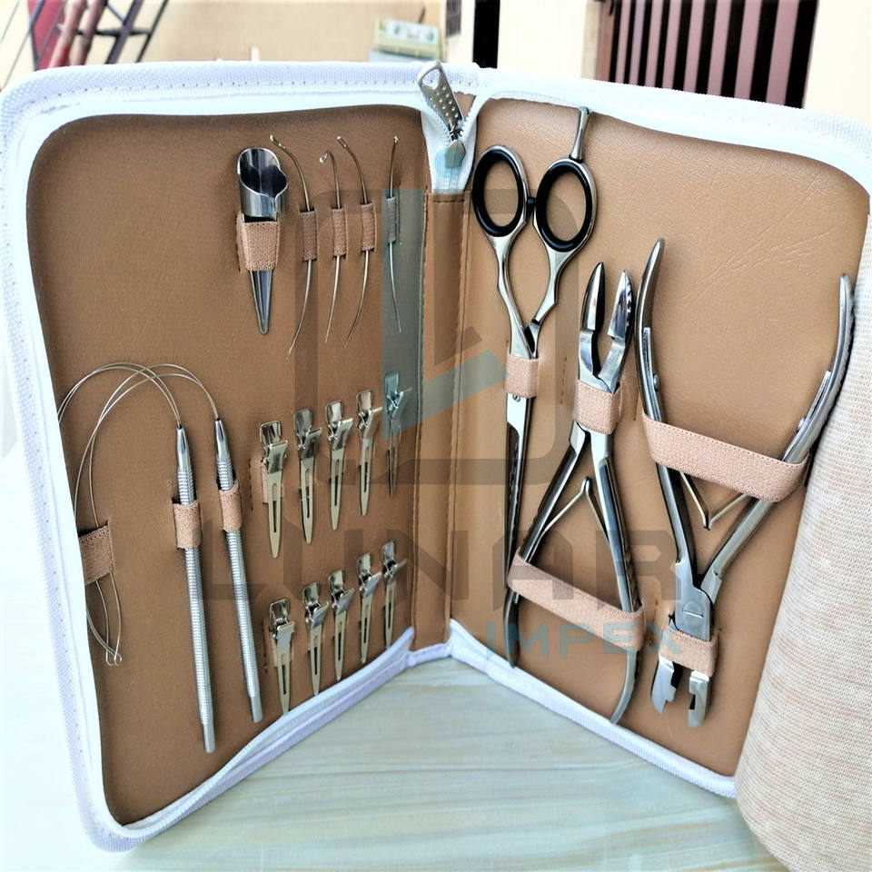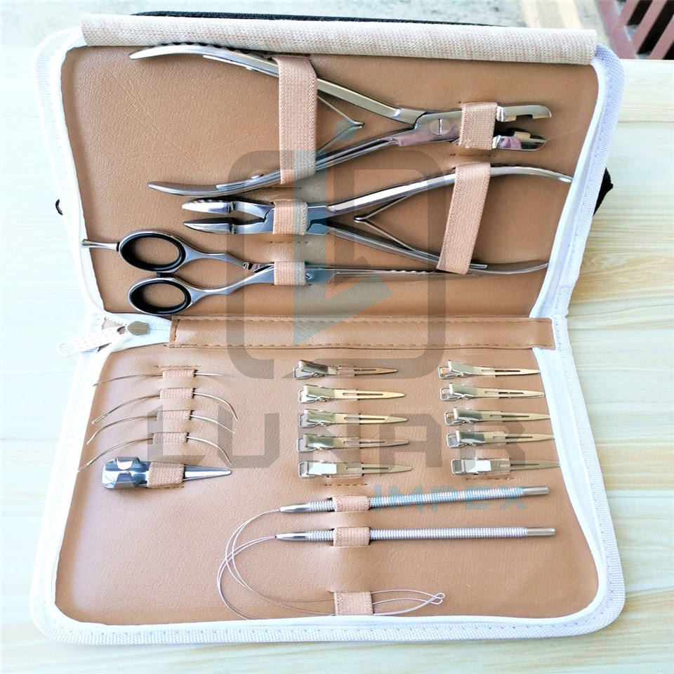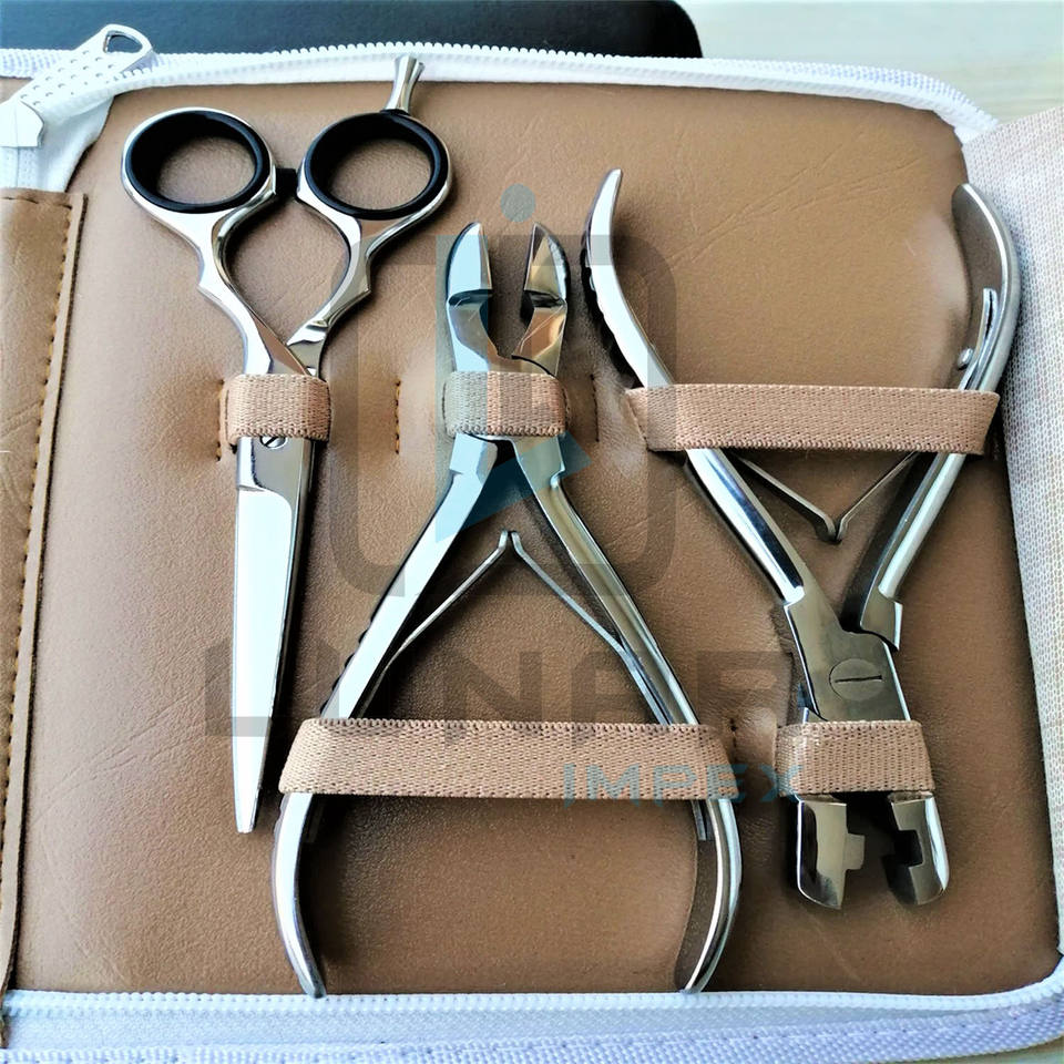 Kit de herramientas de extensión de cabello, caja de cuero de PVC, color blanco tostado, doble capa, pulido de plata, acabado con alicates de 6,5 pulgadas