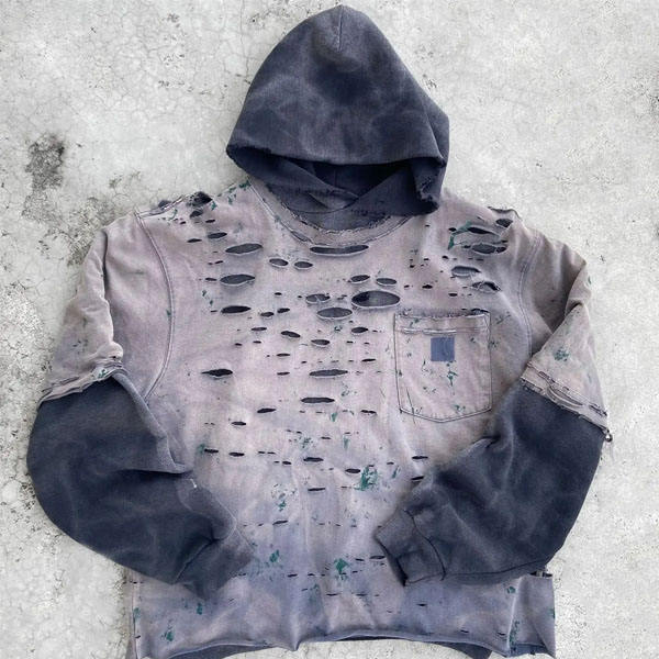 Sudadera con capucha de invierno de doble capa, desgastada, rasgada, con efecto descolorido por el sol, con pedrería, con cremallera y bordada, 100% algodón de alto gramaje, lavado ácido