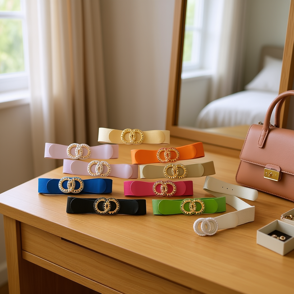 Cinturón elástico de poliuretano con hebilla de doble lazo para mujer, accesorio de moda